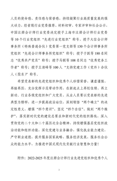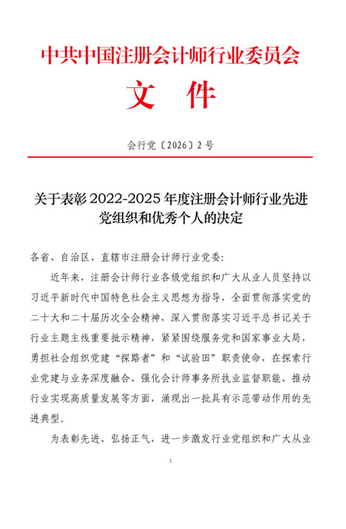 近日,收到中共中國(guó)注冊(cè)會(huì)計(jì)師行業(yè)委員會(huì)文件《關(guān)于表彰2022-2025年度注冊(cè)會(huì)計(jì)師行業(yè)先進(jìn)黨組織和優(yōu)秀個(gè)人的決定》,我所主任會(huì)計(jì)師吳林海同志榮獲注冊(cè)會(huì)計(jì)師行業(yè)“優(yōu)秀黨務(wù)工作者”稱號(hào)。 此次榮獲“優(yōu)秀黨務(wù)工作者”稱號(hào),不僅是對(duì)其個(gè)人工作的認(rèn)可,也是對(duì)我所黨建工作的高度肯定。 我所將以此次獲獎(jiǎng)為契機(jī),進(jìn)一步加強(qiáng)黨建工作,深化黨建與業(yè)務(wù)融合,提升服務(wù)質(zhì)量,堅(jiān)守職業(yè)道德,不斷增強(qiáng)服務(wù)國(guó)家戰(zhàn)略、服務(wù)經(jīng)濟(jì)發(fā)展、服務(wù)社會(huì)公眾的能力。 附件: